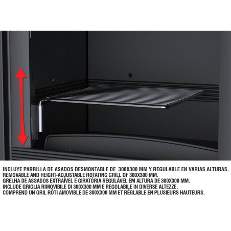 Incluye parrilla de asados desmontable de 300 x 300 mm y regulable en varias alturas.